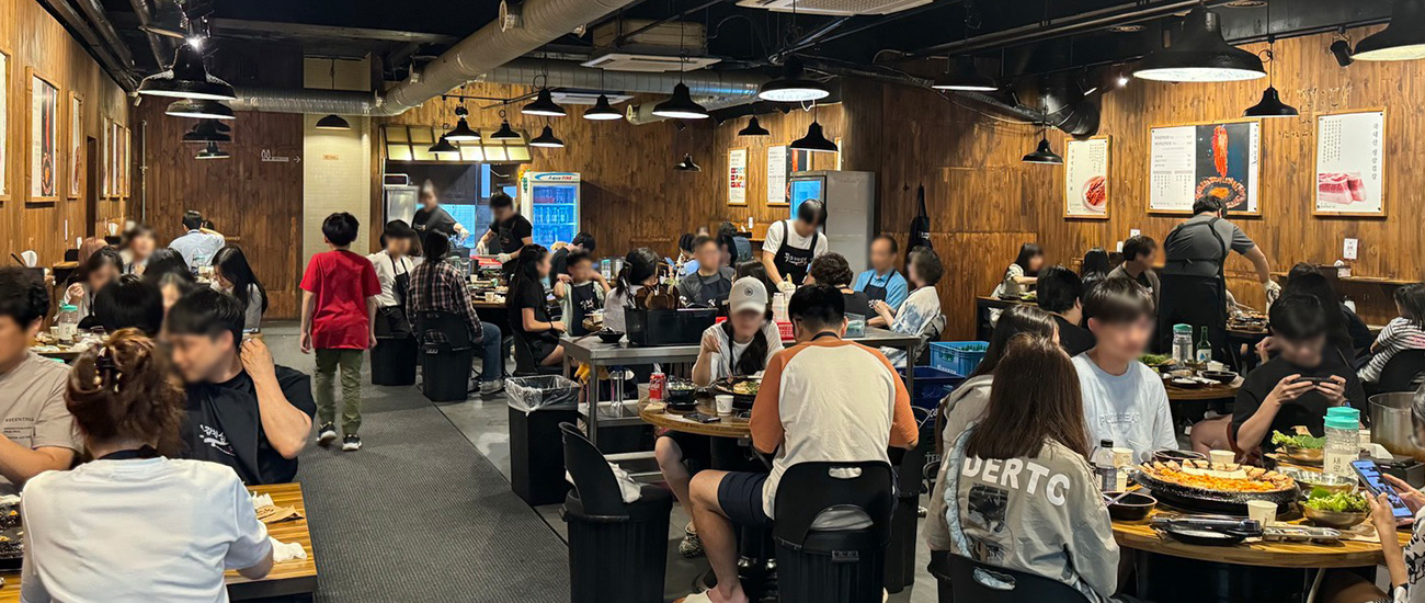 가마솥 뚜껑을 뒤집어서 삼겹살을 통으로 툭툭 올려 굽는 방식.